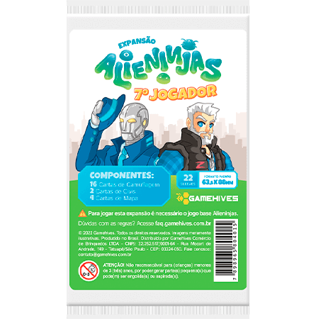 Expanda sua diversão com as novas Cartas de Camulflagem para o jogo Alieninjas. Apresentando Victor, um civil bem conhecido no universo Zurvivors e o Android, um civil programado pela S.O.L.A.R. para interagir com os humanos da cidade. Esta expansão acompanha também 4 novas Cartas de Mapa para deixar o seu jogo ainda mais divertido!